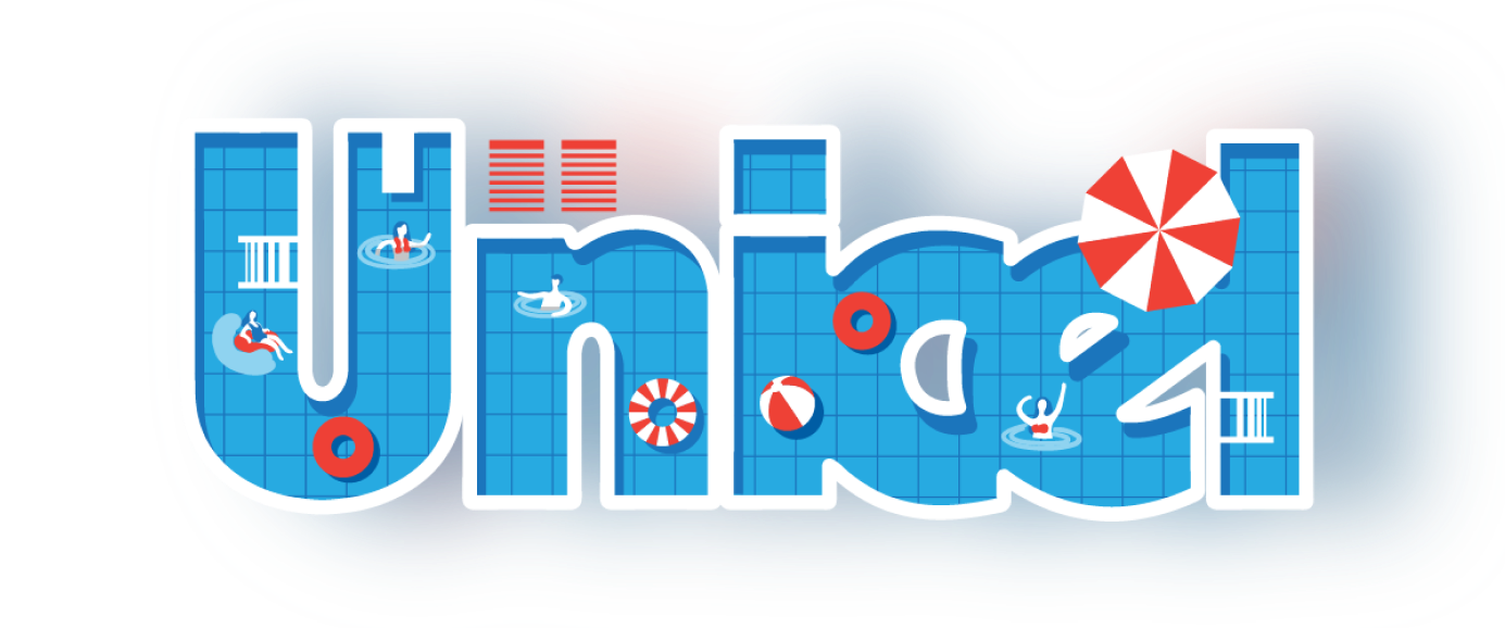 Colorful pool-themed graphic with the word 'SUMMER' in large letters. The letters resemble a swimming pool with water and pool toys, including a beach ball, umbrella, and swimming pool floats.